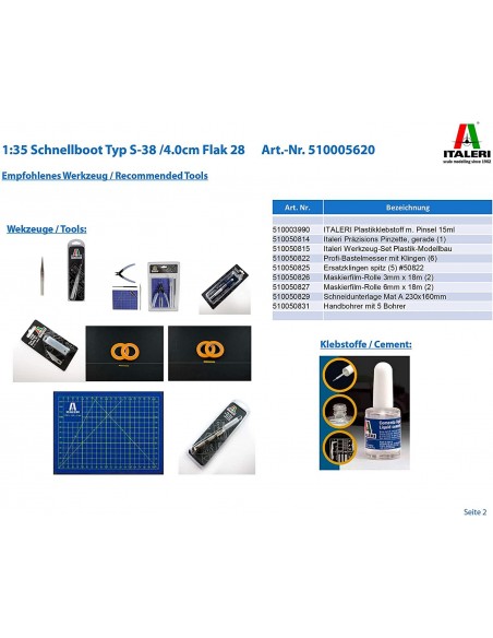 Barca rápida tipo S-38/4,0 cm Flak 28. El modelo de barco rápido tipo S-38/4,0 cm Flak 28 en escala 1:35 tiene una longitud de aprox. 999 mm. Los kits de construcción y modelos acabados de Italeri, el fabricante italiano tradicional de finas miniaturas, entusiasman a los modelistas de todo el mundo desde hace más de 50 años. Durante los años se han creado una buena reputación y una gran comunidad de seguidores. Italeri produce desde 1962 kits y modelos prefabricados en la más alta calidad y adaptación, en las escalas 1:16 hasta 1:720. Las herramientas, los colores y otros accesorios de Italeri se utilizan entre marcas y gozan de una gran popularidad. Los kits ITALERI se pueden pintar según tus propias ideas. Para terminar se necesitan pinturas, pegamento y herramientas pequeñas. La serie para principiantes My First Model Kit y modelo Set ya contienen colores e incluso herramientas. Forma totalmente actualizada, accesorios fotográficos y más de 600 piezas altamente detalladas. Atención: no recomendado para niños menores de 14 años.