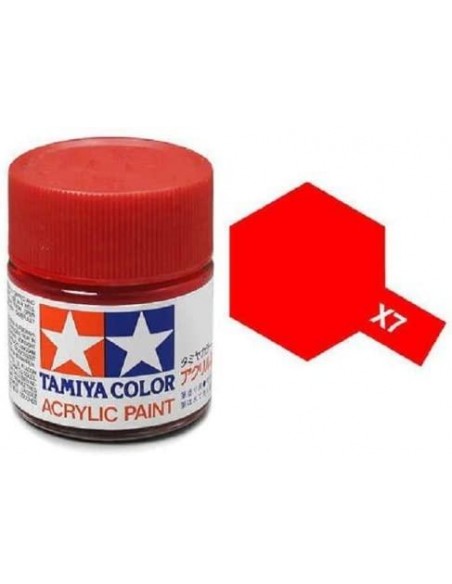 Pintura acrílica de Tamiya, color rojo número X-7. Hecha de resina acrílica soluble en agua, excelente para pintura o pintura en aerosol. Puede ser utilizada en resinas de Styrol, poliestireno, madera, además de todos los plásticos habituales de modelismo.